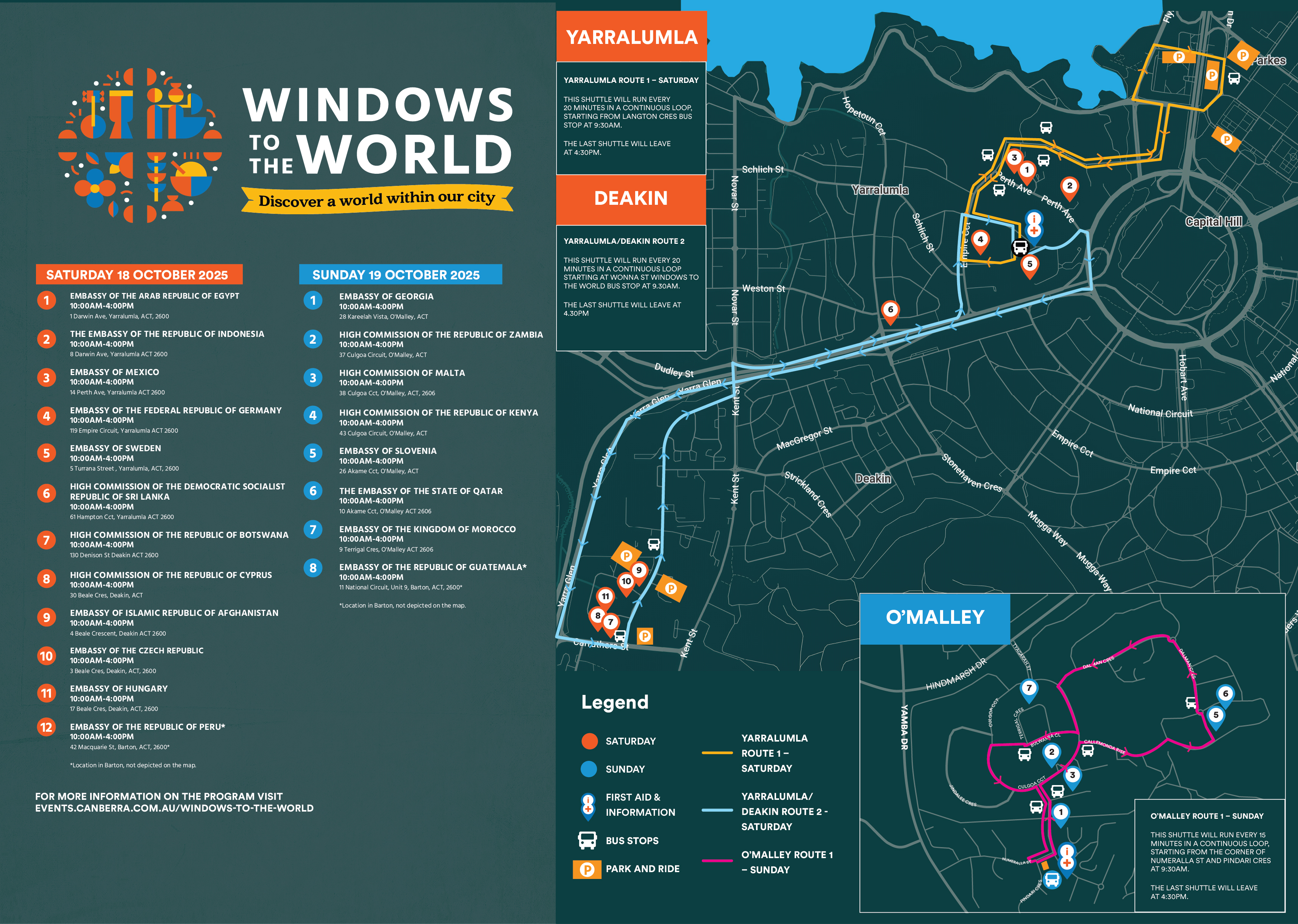 There are 2 shuttle bus route options on Saturday (Yarralumla 1 and Yarralumla 2) and one shuttle bus route on Sunday (O’Malley loop).
